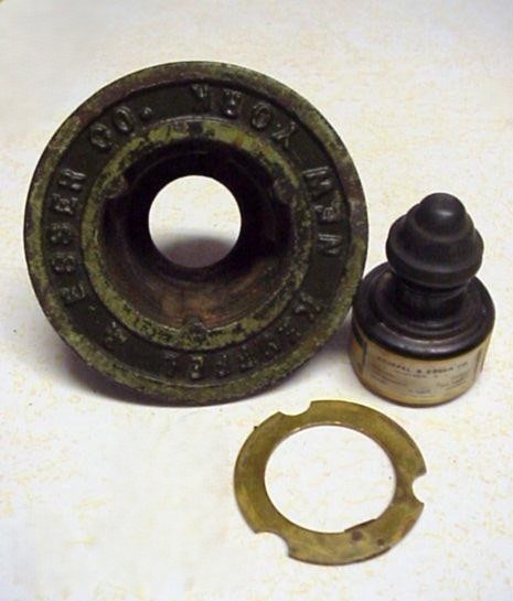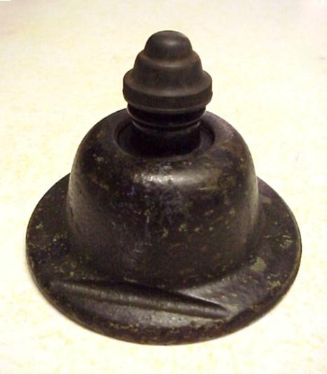 Ink Bottle Holder/Paperweight + Ink Bottlec.1909 matched set – Black Enameled Iron – about 2lbs. nominal (K&E Model # 2707 per pg. 266 of K&E’s 1909 Catalog) -1b