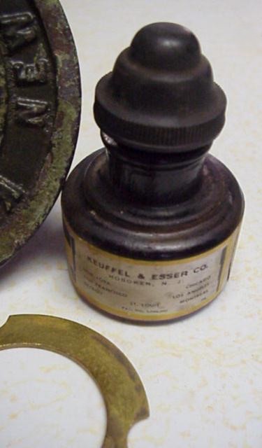 Ink Bottle Holder /Paperweight + Ink Bottlec.1909 matched set – Black Enameled Iron – about 2lbs. nominal (K&E Model # 2707 per pg. 266 of K&E’s 1909 Catalog) -1c
