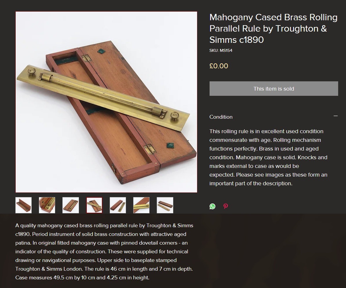 Rolling Parallel Rule (brass) with Wooden CaseUnknown Makerc.1890’s-c.1940’s – 10.8 lbs – rule 2.02’x0.24′ – case 2.1’x0.33’x0.17′ -1hh