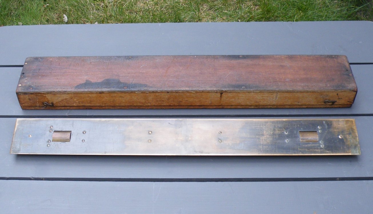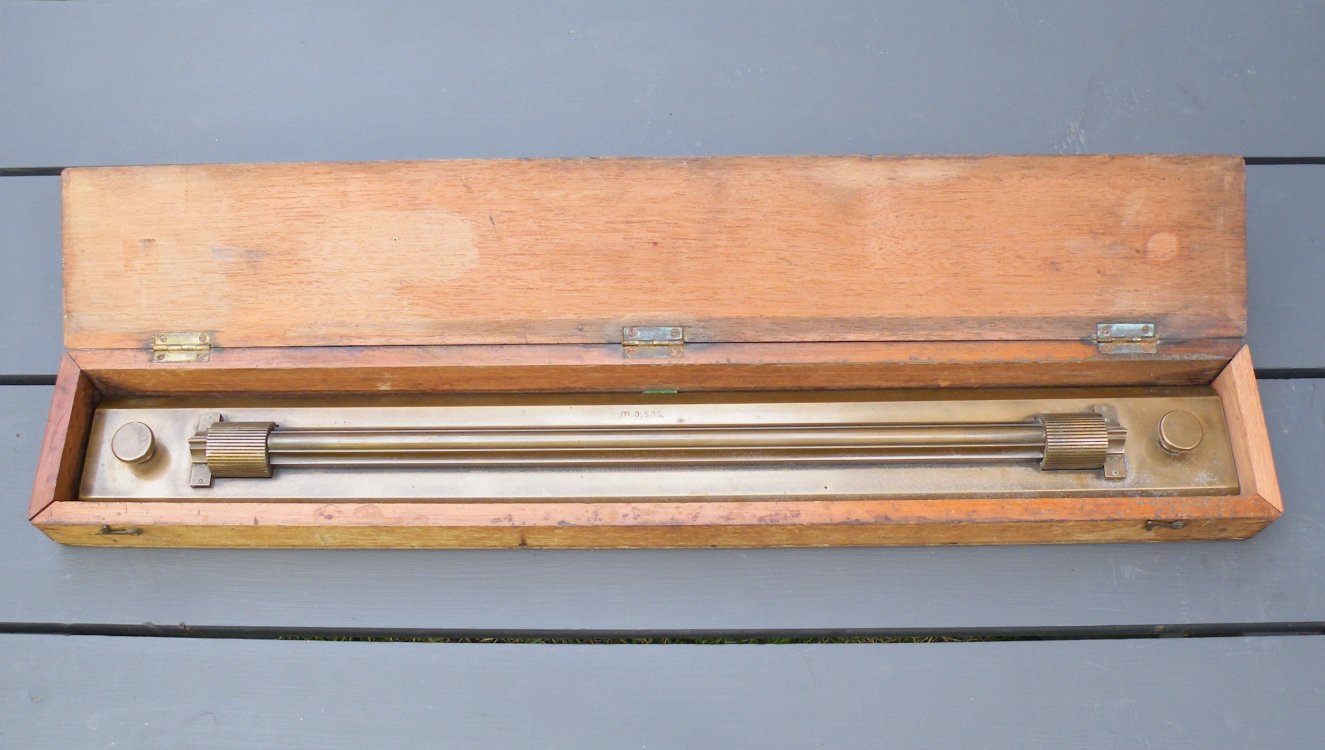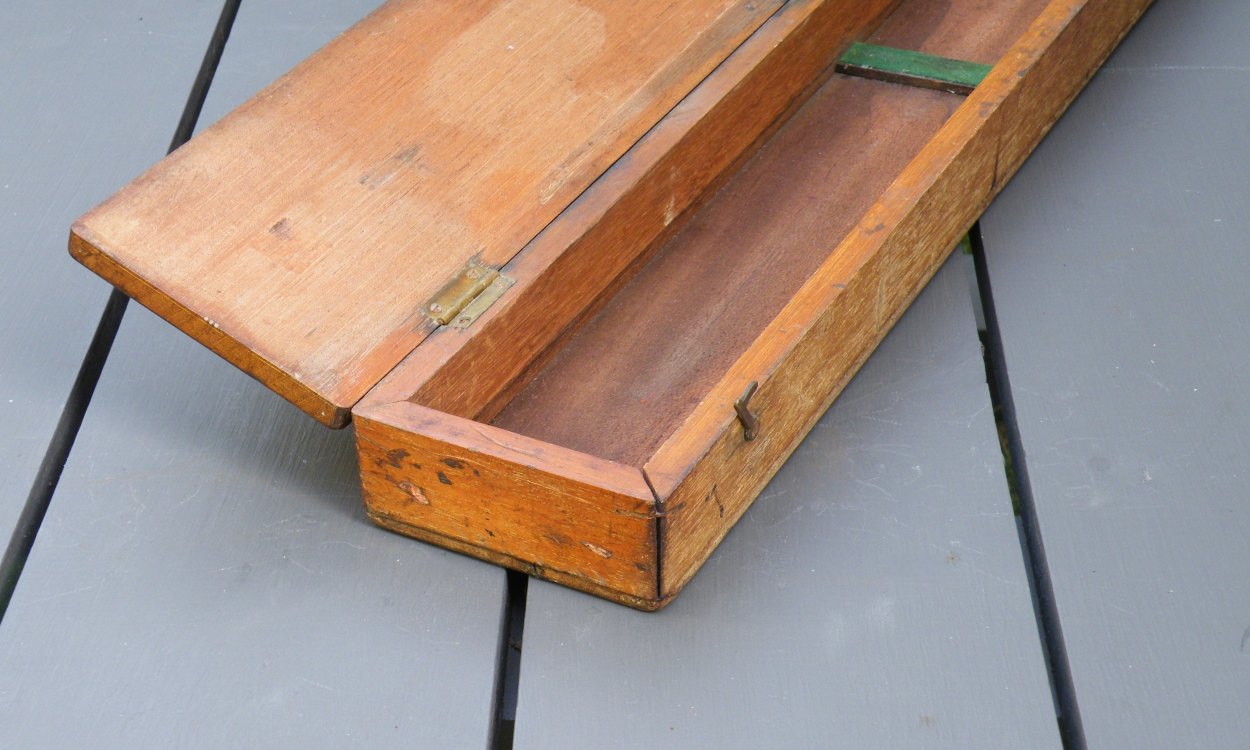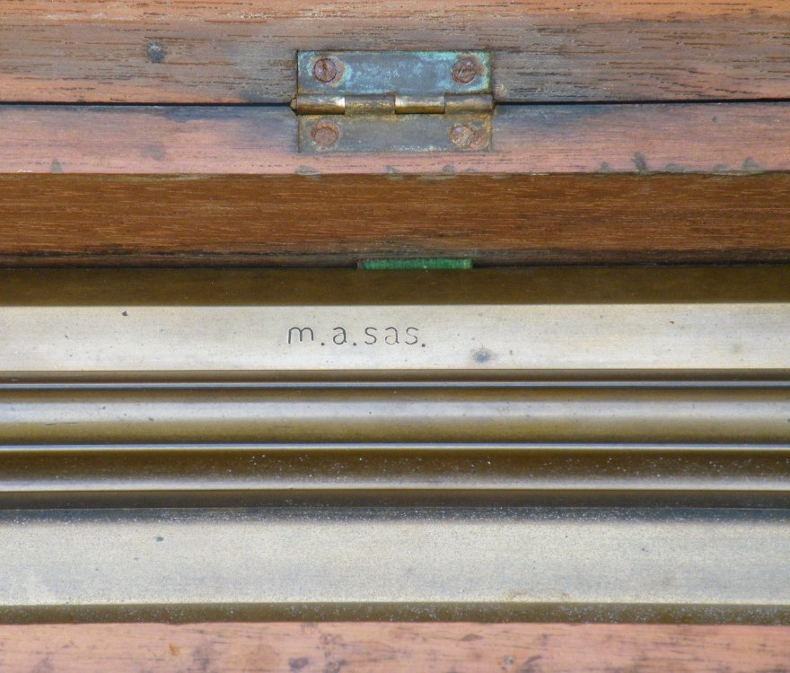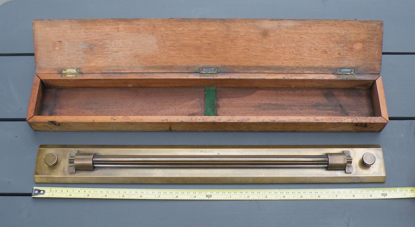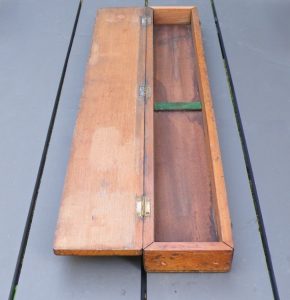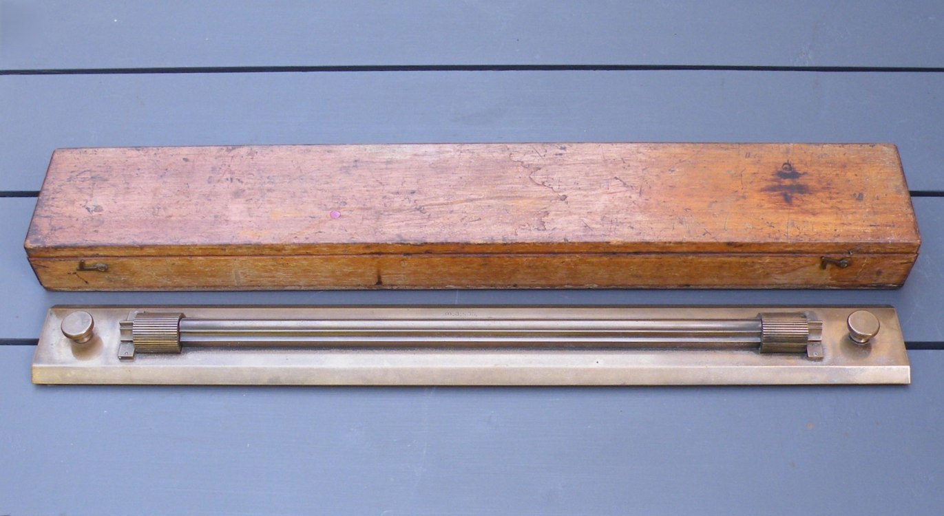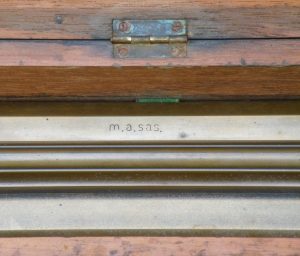 Rolling Parallel Rule (brass) with Wooden CaseUnknown Maker (lettering unidentified) – c.1890’s-c.1940’s – 10.8 lbs. – rule 2.02’x0.24′ – case 2.1’x0.33’x0.17′ -1gg