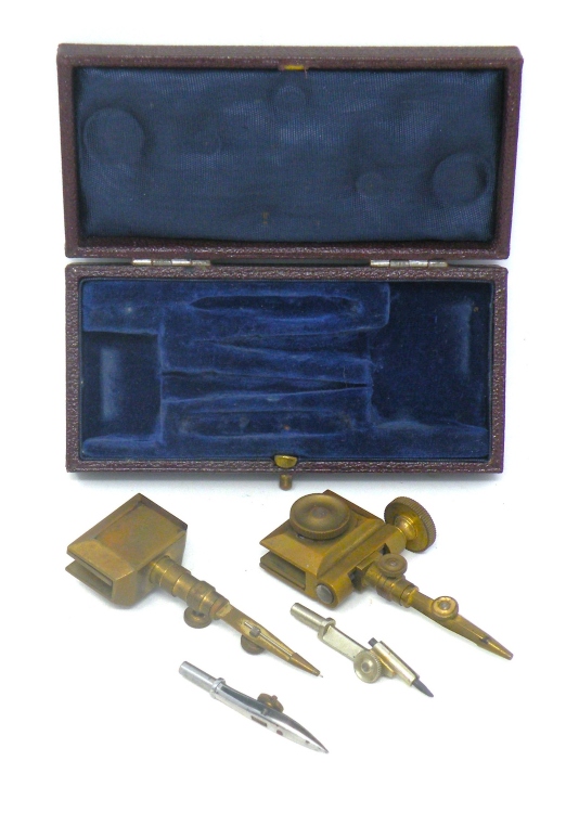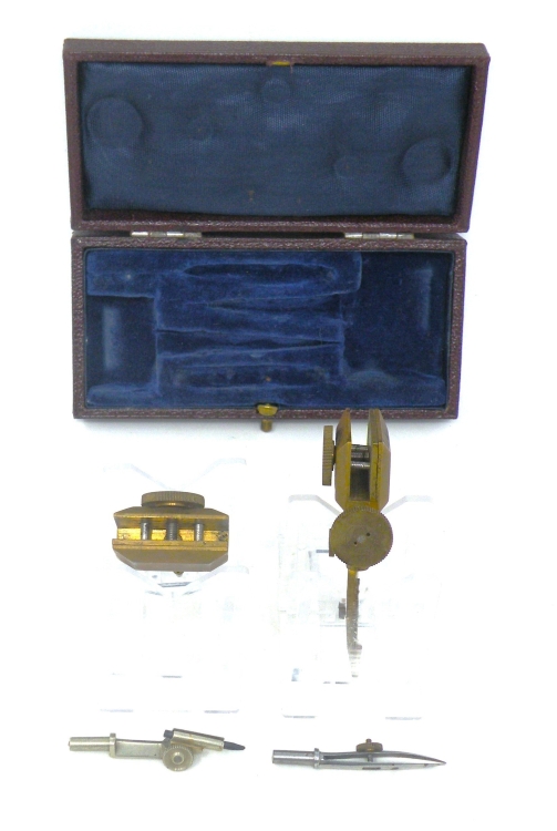 Trammel Points Set (brass) – Unknown Makerc.late1800’s estimated – with fitted burgundy Shagreen Case (lined in blue velvet & silk) -1bb