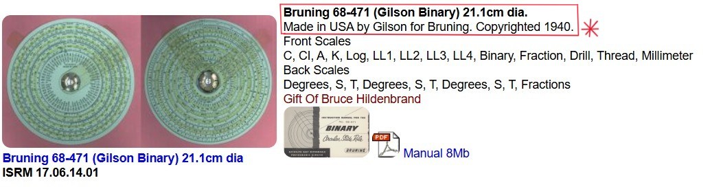 Bruning – ”Circular Slide Rule (aka ‘Gilson Binary’)” 21.1cm dia. (copy of listing from on-line ”Slide Rule Museum”)
