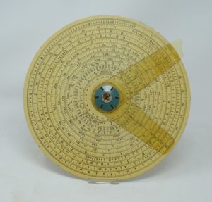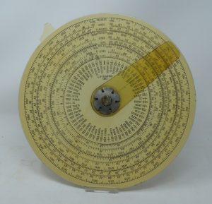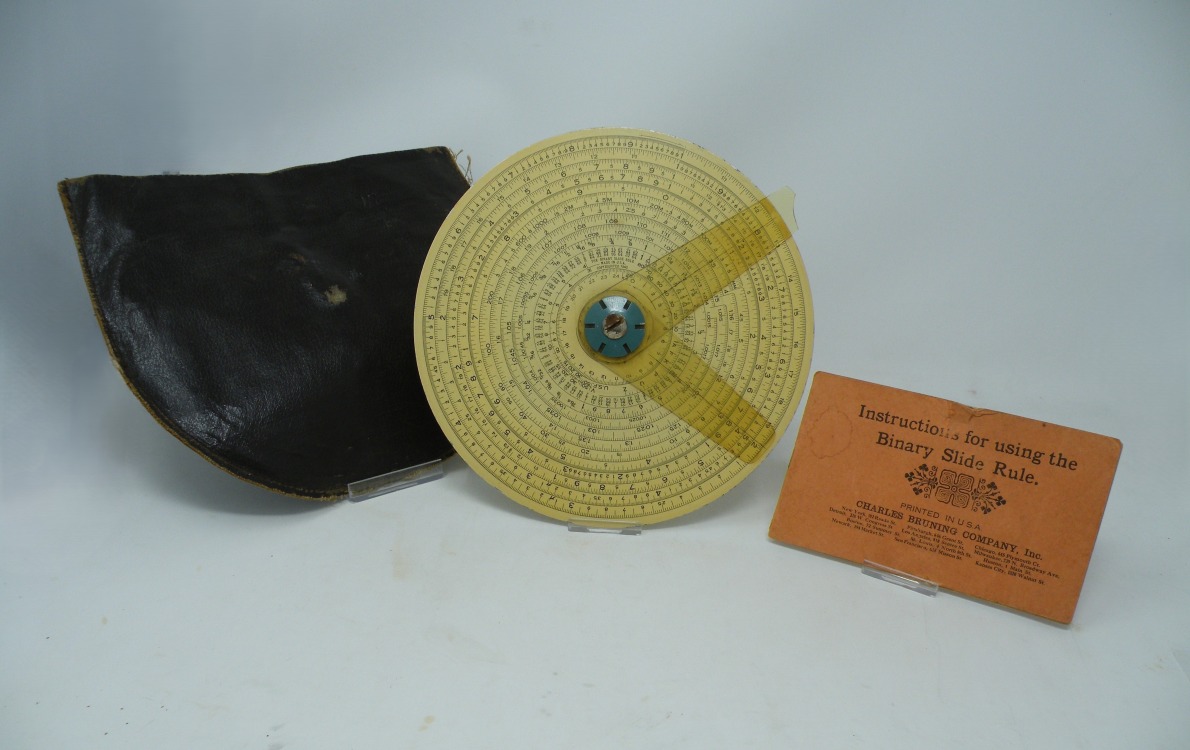 Bruning – ”Circular Slide Rule (aka ‘Gilson Binary’)” – 8.31” dia. (c.1940-c.1960) c/w Original Fabrikoid Case & Instruction Booklet – TOUGH COMBO to FIND -1cc (front)