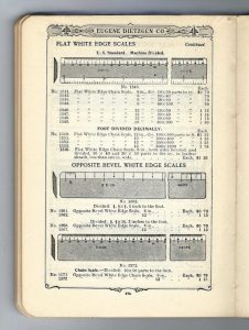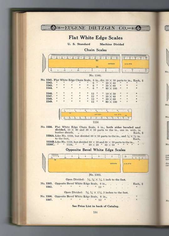 Dietzgen 1931 Catalog – pg.184 listings for ”Flat Opposite Bevel White Edge Scales” #1562 & #1567