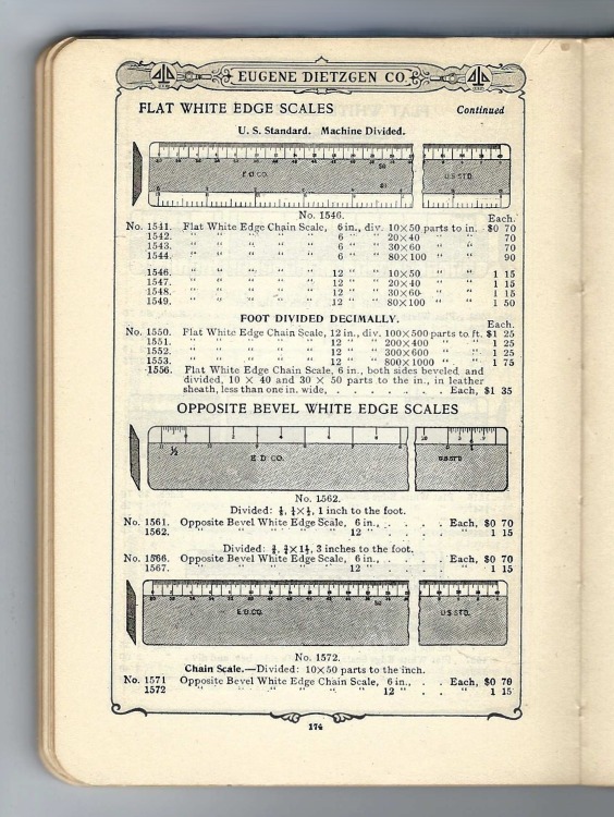 Dietzgen 1907 – 1908 Catalog – pg.174 listings for ‘‘Flat Opposite Bevel White Edge Scales” #1562 & #1567