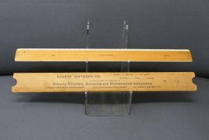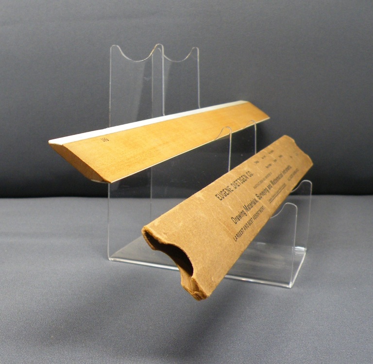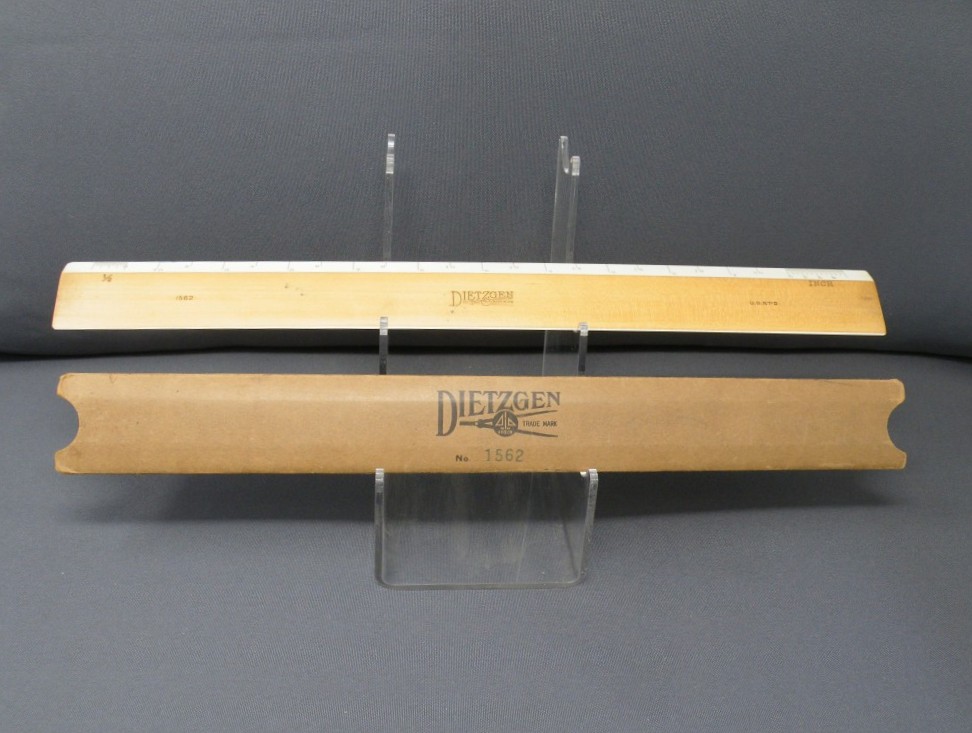 Dietzgen Flat Opposite Bevel White Edge Scale #1562 – 12” (Architect’s Style, boxwood with ivory inlay, c.1905-c.1935) + Carboard Case (front detail) -1ee