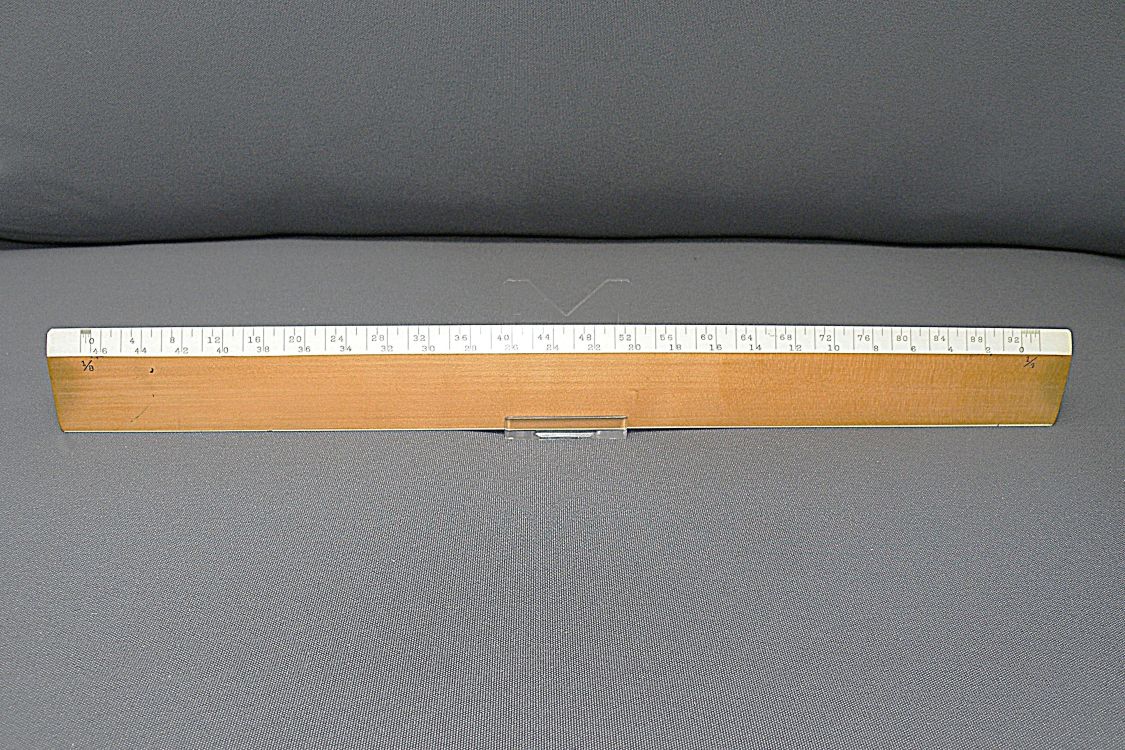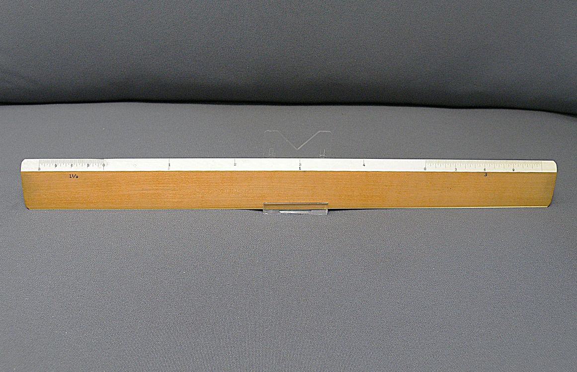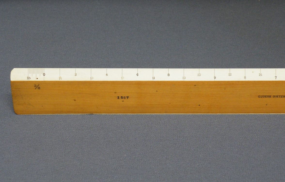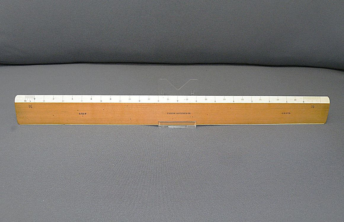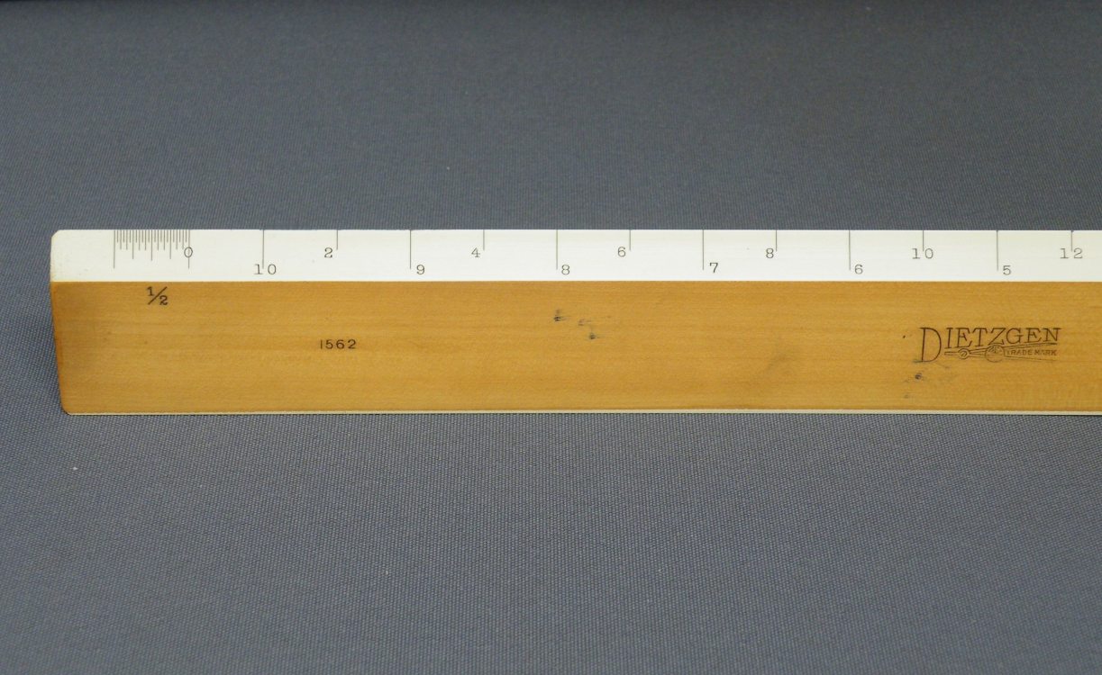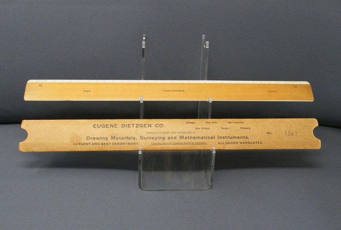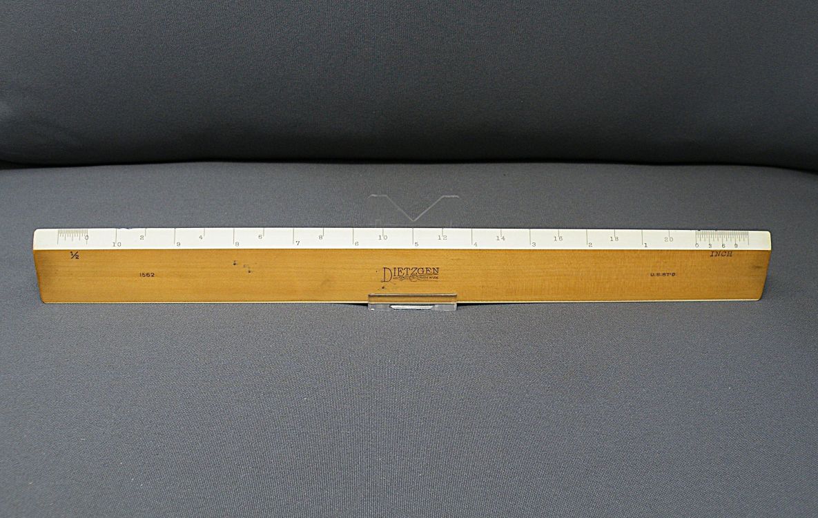 DietzgenFlat Opposite Bevel White Edge Scale #1567 – 12” (Architect’s Style, boxwood with ivory inlay, c.1905-c.1935) + Carboard Case – (front detail) -1ee