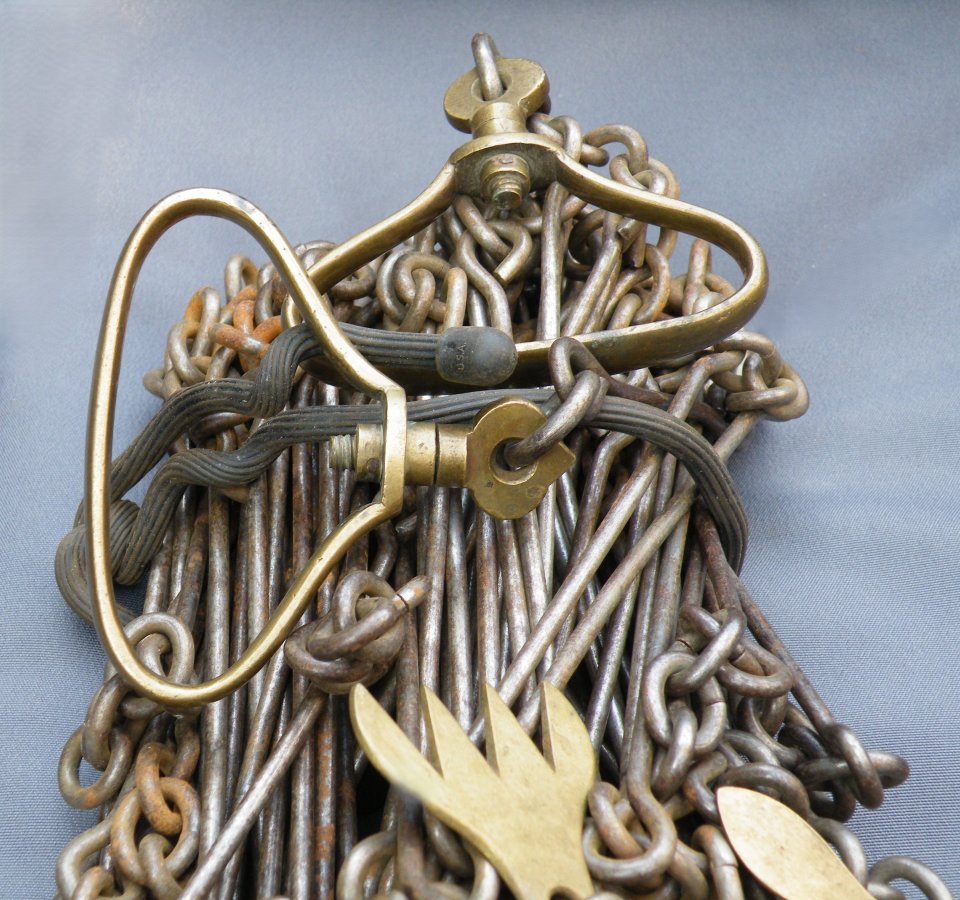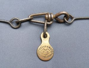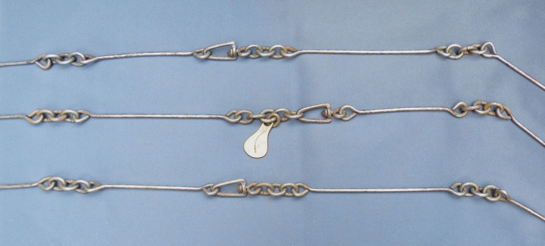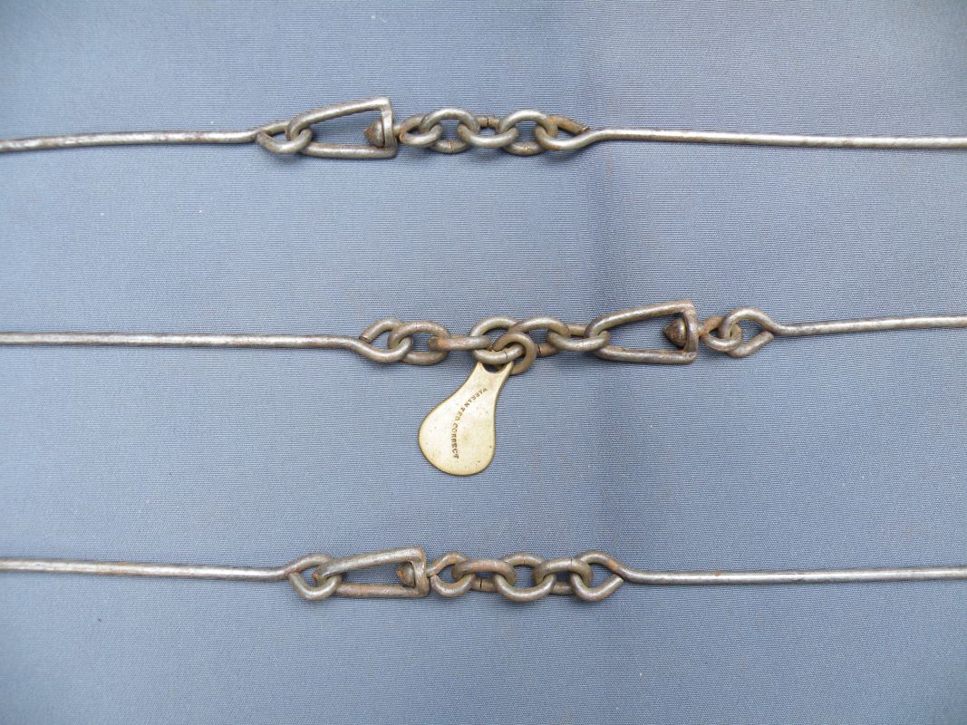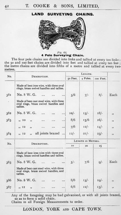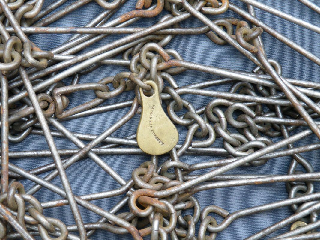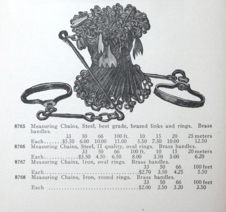 The classic “Gunter’s or Surveyor’s Chain” was 66’ long and comprised of 100 japanned steel or iron heavy wire links (each link 0.66’ or 7.92” long) with brass handles at each end, periodic rotating joints to prevent kinking & 9 brass tallies (markers) every 10 links. While 66’ was the most common length, the “Surveyor’s Chain” was less often made in lengths of 33’, 50’ & 100’ and also in various other styles, including metric versions.