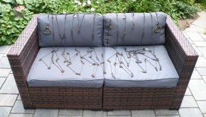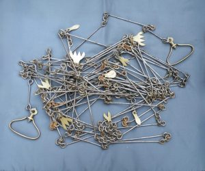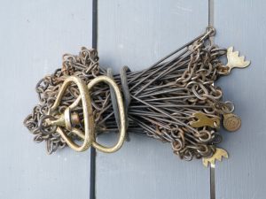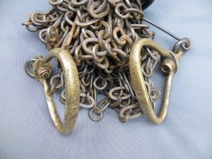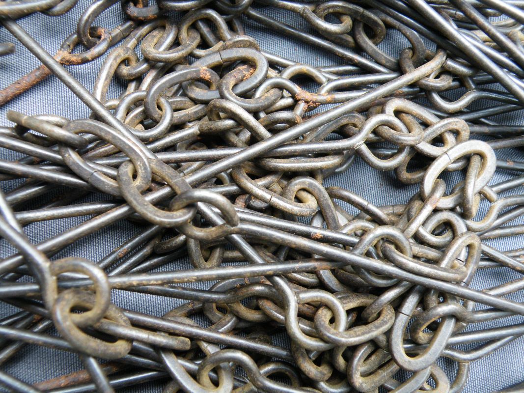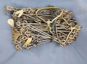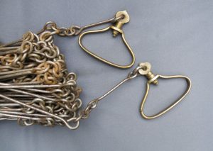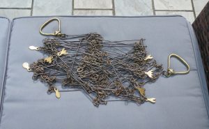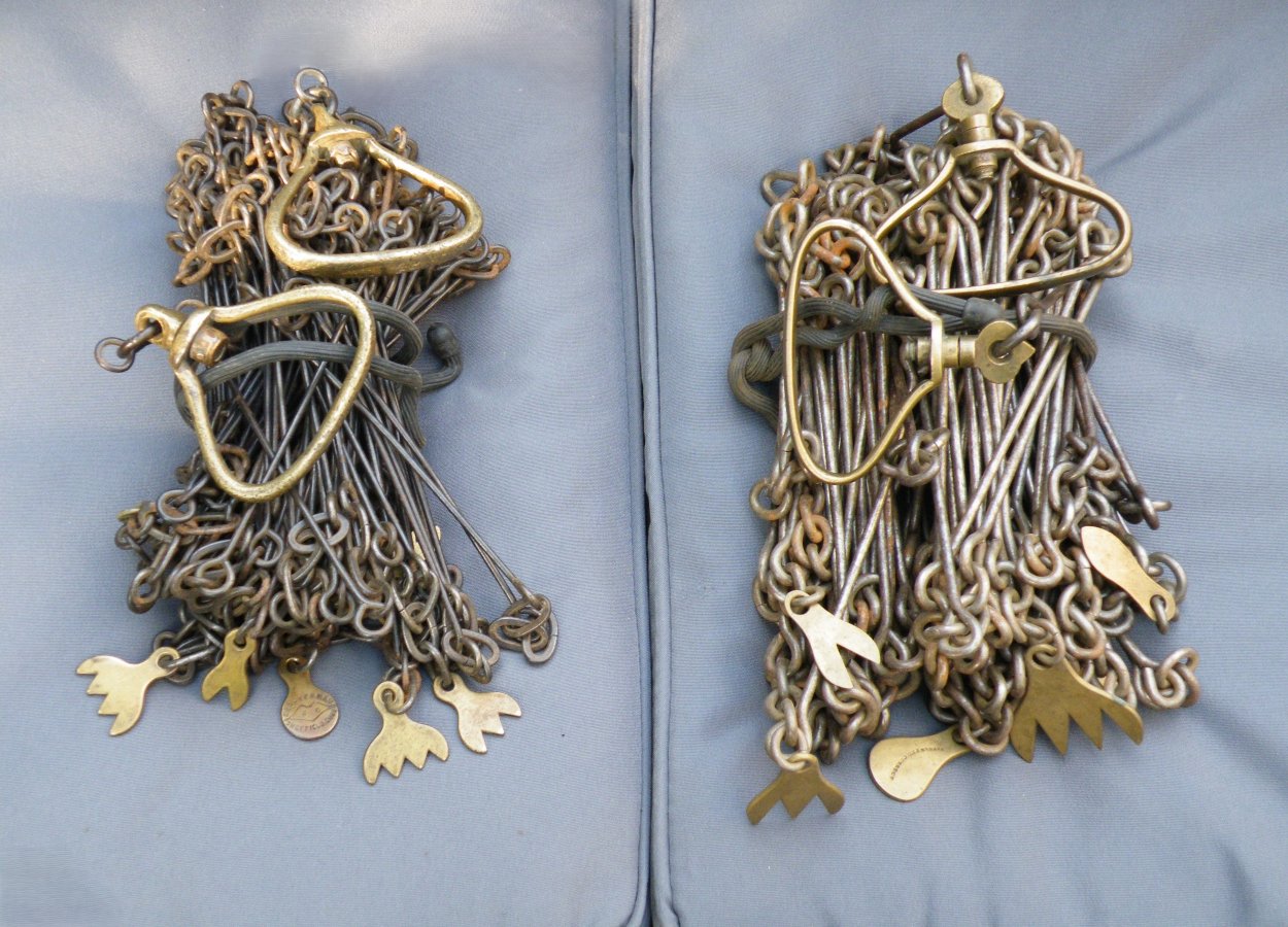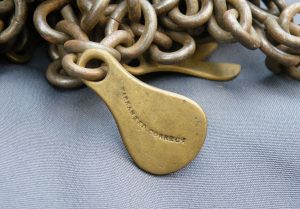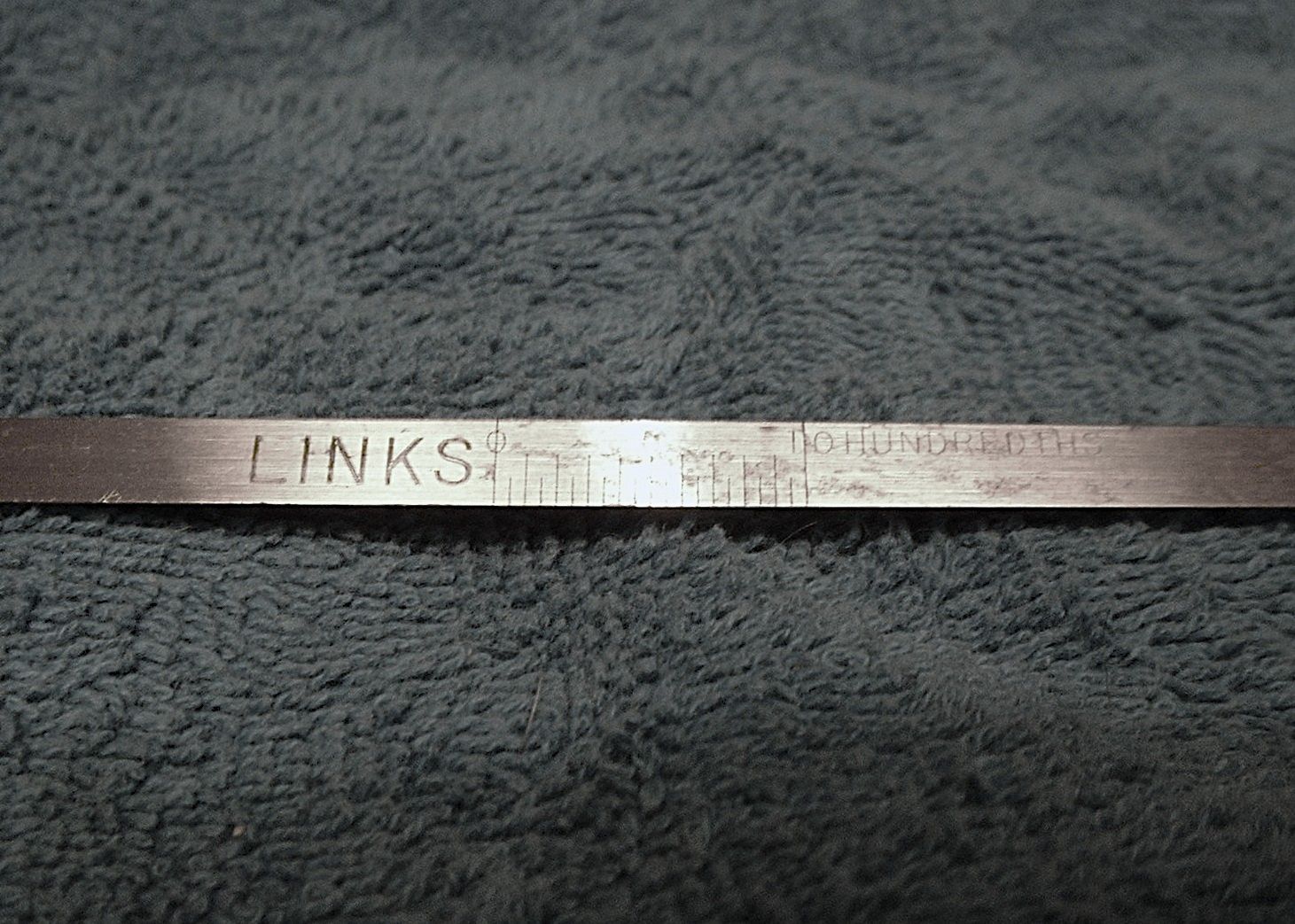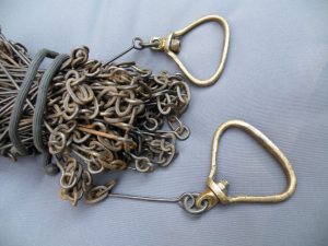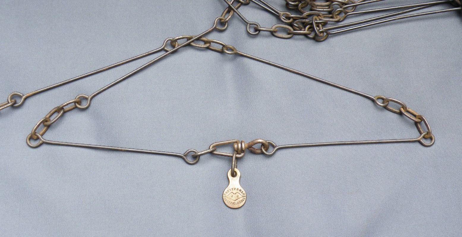 The classic “Gunter’s or Surveyor’s Chain” was 66’ long and comprised of 100 japanned steel or iron heavy wire links (each link 0.66’ or 7.92” long) with brass handles at each end, periodic rotating joints to prevent kinking & 9 brass tallies (markers) every 10 links. While 66’ was the most common length, the “Surveyor’s Chain” was less often made in lengths of 33’, 50’ & 100’ and also in various other styles, including metric versions.