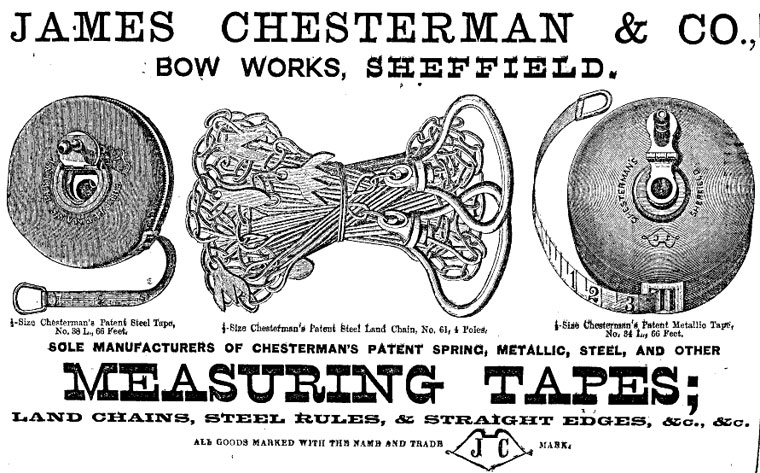 Throughout the period from the mid 1800’s to the mid or late 1900’s, the most common tools for accurately measuring land & moderate distances were the “Gunter’s or Surveyor’s Chain” invented c.1620 by Englishman, Edmund Gunter & the “Surveyor’s Steel Measuring Tape” which gradually began to displace the “Surveyor’s Chain” beginning in the mid to late 1800’s (perhaps with Eddy & Company’s c.1867 American patented steel tape). Fine wire reinforced cloth tapes were also introduced by Chesterman c.1843, but while they served a purpose, were not as widely used for surveying as the “Surveyors Steel Measuring Tapes” introduced about 20 years later, because they were less durable & less accurate. Developments in electronic, infra-red & laser distance measuring & alignment devices in the 1960’s largely displaced common use of the “Surveyor’s Measuring Tape” within a few decades.